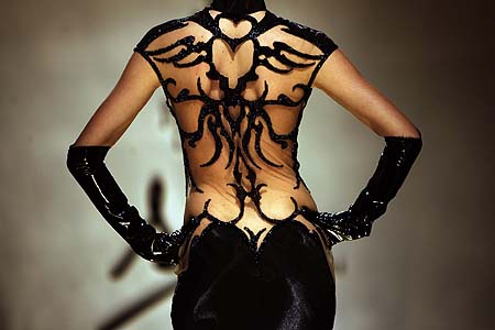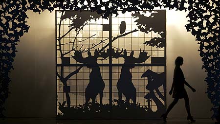 一名模特在巴西圣保羅2007秋冬時(shí)裝周上表演。這場(chǎng)表演的舞臺(tái)設(shè)計(jì)猶如剪紙?jiān)煨汀?/P>