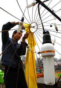 2月6日,工作人員在為安上節(jié)能燈的彩燈布置裝飾物。 為降低能耗,今年即將舉辦的第39屆成都燈會(huì)所使用的白熾燈全部換上節(jié)能燈,預(yù)計(jì)用電量?jī)H為2006年燈會(huì)用電量的一半,節(jié)約電費(fèi)10多萬元。第39屆成都燈會(huì)將于2月18日正式亮燈。