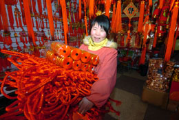 2006年,臨沂市各大專業(yè)批發(fā)市場實現(xiàn)交易總額450億元,帶動了老區(qū)近百萬農(nóng)村勞動力進城就業(yè)。圖為2月12日,來自蒙陰縣的打工妹劉溶在臨沂西郊年貨商品批發(fā)城搬運春節(jié)飾品。
