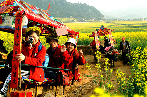 云南省羅平縣素有“油菜之鄉(xiāng)”的美稱,目前,全縣種植的36.6萬(wàn)多畝生態(tài)油菜正值盛花期,每天吸引萬(wàn)名游客來此觀光。羅平縣實(shí)施“花開時(shí)分搞旅游,收獲時(shí)節(jié)賣菜籽”的發(fā)展方針,既拉動(dòng)了菜花觀賞旅游業(yè)的發(fā)展,又促進(jìn)了科學(xué)種田和農(nóng)村生態(tài)環(huán)境保護(hù),農(nóng)民從中得到雙重收益。