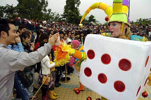 游客在廣州長隆歡樂世界與巡游小丑親密接觸(2月18日攝)。 據廣東省旅游局發(fā)布的數據顯示,廣東省在2007年春節(jié)黃金周共接待旅游者2018.9萬人次,實現旅游收入102.92億元,同比增長9.04%。