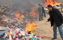 3月14日,工作人員在焚燒假冒偽劣商品。當(dāng)日,青海省工商行政管理部門展開全省銷毀假冒偽劣商品統(tǒng)一行動(dòng),總案值近300萬元的假冒偽劣食品、藥品、煙、酒、書籍、光盤等被銷毀。