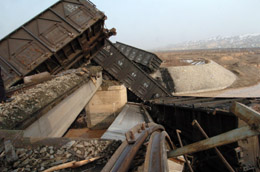 3月18日15時40分許,由烏魯木齊北約70公里的阜康開往烏魯木齊火車北站的專線運煤列車在阜康市境內經(jīng)過一鐵路橋梁時,橋梁坍塌,機車頭后部有九節(jié)運煤車廂脫軌,其中八節(jié)側翻,三節(jié)墜落河中。截至當日17時,沒有人員傷亡的報告。目前烏魯木齊鐵路局和阜康市有關部門已趕到現(xiàn)場處理事故。事故原因尚在進一步調查中。