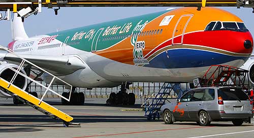 18日,中國(guó)東方航空公司的“世博號(hào)”客機(jī)降落在日本東京成田機(jī)場(chǎng),中國(guó)2010年上海世博會(huì)海外區(qū)域推廣活動(dòng)由此拉開(kāi)帷幕。東航“世博號(hào)”客機(jī)為全長(zhǎng)74.8米的空客A340-600型飛機(jī),機(jī)身噴繪了2010年上海世博會(huì)會(huì)徽及世博會(huì)主題“城市,讓生活更美好”的英文表述“Better City,Better Life”。