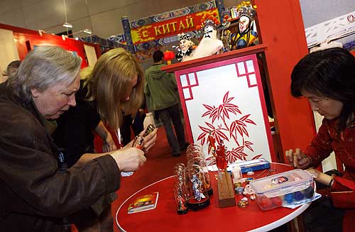 19日,在俄羅斯首都莫斯科的克洛克斯展覽中心,兩名外國參觀者欣賞中國展臺展出的面塑工藝品。當日是2007莫斯科世界旅游博覽會的“中國日”,中國展臺展出的剪紙、面塑等富有民族文化特色的手工藝品以及少林武僧表演等活動吸引了大批外國參觀者。