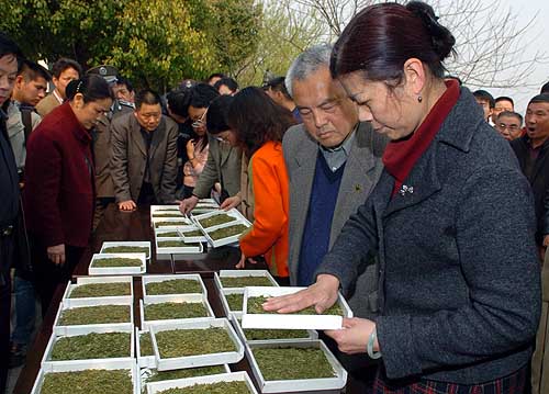 3月22日,茶葉專家正在現(xiàn)場查看剛剛炒制出來的西湖龍井茶的色澤。當(dāng)天,2007年西湖龍井炒茶技藝大賽在杭州舉行,30多位來自西湖龍井茶區(qū)的炒茶高手爭奪2007年“炒茶王”桂冠,比賽結(jié)束后,經(jīng)過專家組對茶葉色澤、香氣、湯味等指標(biāo)的嚴格評選,最后精選的200克極品西湖龍井“茶王茶”當(dāng)場被買家以11萬元的天價拍走。