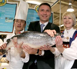 3月27日,挪威首相斯托爾滕貝格(中)在北京一超市內(nèi)展示來自挪威的三文魚。當(dāng)日,挪威三文魚中國推廣活動在北京拉開帷幕,正在北京訪問的挪威首相斯托爾滕貝格及其一行親臨現(xiàn)場,品嘗三文魚食品,“推銷”挪威產(chǎn)三文魚。