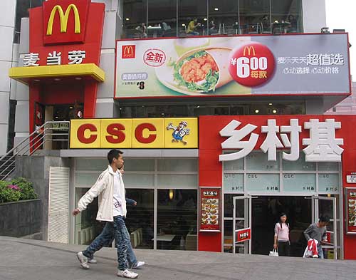 3月27日,兩位市民經(jīng)過重慶觀音步行街的快餐店,樓上是洋快餐“麥當(dāng)勞”,樓下是本土快餐“鄉(xiāng)村基”,兩家快餐同樓競爭。