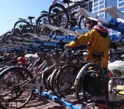 4月2日,工作人員在北京崇文門附近的一個(gè)自行車存放處安裝雙層自行車停放裝置。這種雙層自行車裝置不僅可以在有限的空間內(nèi)停放更多的自行車,還可以更好地保證自行車的安全,使用者可以通過拉桿輕松地存取車輛。
