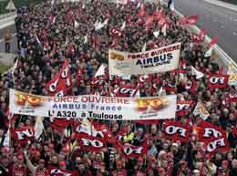 4月3日,在法國圖盧茲市的布拉尼亞克機場附近,歐洲空中客車公司的員工舉行游行示威,抗議空客的重組計劃。根據(jù)重組計劃,空客將在歐洲裁員一萬人,其中法國4300人。