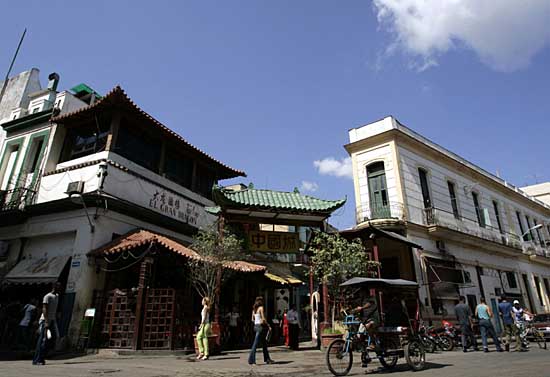 3日,人們在古巴首都哈瓦那的華人街上行走。在哈瓦那有一條具有濃厚中國特色的華人街。高懸的大紅燈籠,傳統(tǒng)的街道牌坊,地道的中國小吃,工整的金字對聯(lián),讓這條華人街成為哈瓦那一道獨特的風景。