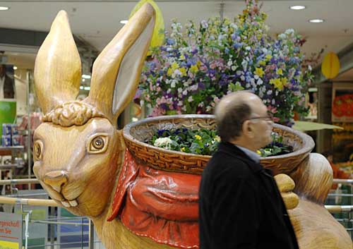 4日,在德國首都柏林的一家商場,一名顧客從一只復(fù)活節(jié)兔子雕像旁走過。復(fù)活節(jié)將至,柏林各商場都以復(fù)活節(jié)為主題裝點(diǎn)店面,喜迎這一初春的節(jié)日。
