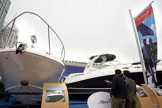 4月5日,參觀(guān)者在參展游艇前駐足。當(dāng)日,2007中國(guó)(上海)國(guó)際游艇展在上海展覽中心開(kāi)幕,來(lái)自世界各地的70多艘各式游艇實(shí)船參展,除了有頂級(jí)的豪華游艇外,各式中、低價(jià)游艇紛紛亮相,成為亮點(diǎn)。