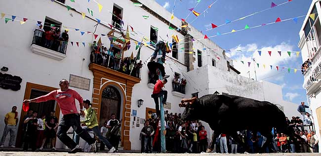 8日,在西班牙南部小鎮(zhèn)貝赫爾-德拉弗龍?zhí)乩,一名男子在一頭公牛前奔跑。當(dāng)天是這個(gè)小鎮(zhèn)傳統(tǒng)的節(jié)日奔牛節(jié),盡管它與著名的西班牙潘普洛納奔牛節(jié)規(guī)模不能相比,但是小鎮(zhèn)居民和游客仍對(duì)此節(jié)日充滿激情。