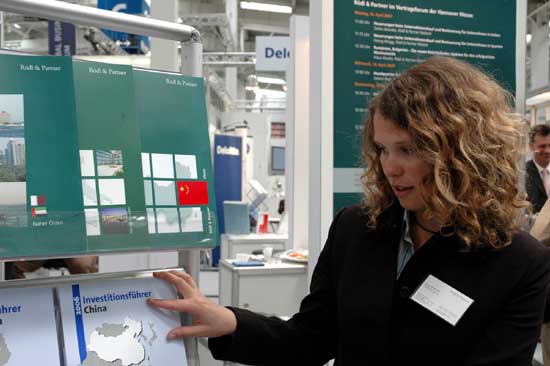 16日,在德國(guó)漢諾威,全球著名的會(huì)計(jì)師事務(wù)所羅德及合伙人集團(tuán)工作人員在漢諾威工業(yè)博覽會(huì)的展臺(tái)前展示介紹中國(guó)投資環(huán)境的刊物。德國(guó)漢諾威工業(yè)博覽會(huì)15日開(kāi)幕,中國(guó)共有400家企業(yè)參展。