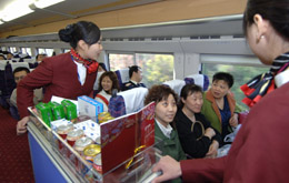 4月18日,乘務(wù)員在“和諧號”動車組D581次列車上為旅客服務(wù)。