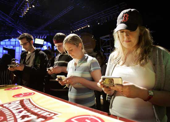 21日,在美國紐約,幾名參加手機(jī)短信比賽的選手在發(fā)短信。當(dāng)日,在一家手機(jī)公司舉辦的手機(jī)短信比賽上,一名來自賓夕法尼亞州的13歲的小女孩獲得“東海岸冠軍”。屆時,她將與來自洛杉磯的“西海岸冠軍”爭奪最后的勝利。
