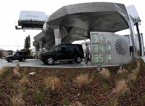22日,顧客們在美國洛杉磯一家加油站內(nèi)為汽車加油。這座英國石油公司經(jīng)營的加油站采用了一系列的環(huán)保措施,包括使用90塊太陽能板獲取能源、用不銹鋼的頂棚收集雨水灌溉植被、使用低耗能的照明系統(tǒng)并向顧客發(fā)放用再生紙制作的節(jié)能宣傳卡片等措施。