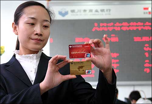 4月23日,銀川市商業(yè)銀行工作人員對比新舊銀聯(lián)如意借記卡。中國銀聯(lián)從7月1日起,將停止“94”字頭如意借記卡的跨行取款和刷卡消費業(yè)務(wù)。新卡片磁條信息上除了記錄持卡人的個人資料之外,還添加有CVN校驗碼,該校驗碼是防范克隆卡和偽卡交易的重要手段,可保護持卡資金安全。凡持“94”字頭的如意借記卡客戶須到銀行各網(wǎng)點免費更換新標(biāo)準(zhǔn)如意借記卡。
