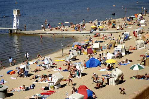 4月28日,市民們?cè)诘聡?guó)首都柏林的一個(gè)湖濱浴場(chǎng)享受陽(yáng)光。由于高溫天氣提前到來(lái),該湖濱浴場(chǎng)于當(dāng)日正式向公眾開放,開始今年夏季的運(yùn)營(yíng)。