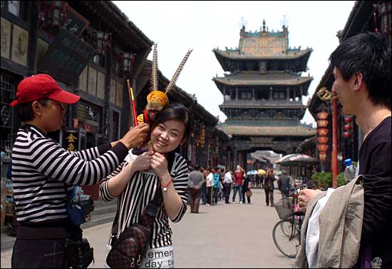 4月29日,在山西平遙古城南大街,一名游客準(zhǔn)備和一只小猴子合影留念。隨著“五一”黃金周的來(lái)臨,山西省平遙古城迎來(lái)了眾多的游客,各個(gè)景點(diǎn)開(kāi)始預(yù)熱,以迎接客流高峰的到來(lái)。