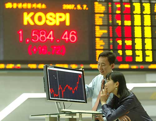 7日,韓國工作人員在首都首爾的證券交易所內(nèi)查看股票價(jià)格。當(dāng)天,韓國首爾股市綜合指數(shù)以1584.46點(diǎn)收盤,創(chuàng)歷史新高。