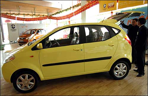 消費(fèi)者正在觀看一輛長(zhǎng)安奔奔汽車。200輛長(zhǎng)安奔奔近日從長(zhǎng)江重慶港裝船,踏上出口阿爾及利亞的旅程。這是長(zhǎng)安奔奔自去年底上市并在國(guó)內(nèi)市場(chǎng)持續(xù)熱銷以來(lái)首次向海外出口。作為長(zhǎng)安汽車集團(tuán)的首款自主品牌轎車,長(zhǎng)安奔奔在低端轎車市場(chǎng)中憑借低價(jià)格與高配置的優(yōu)勢(shì),對(duì)同類車型構(gòu)成嚴(yán)重威脅。短短4個(gè)月,奔奔銷量已達(dá)3萬(wàn)輛。 |
