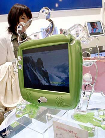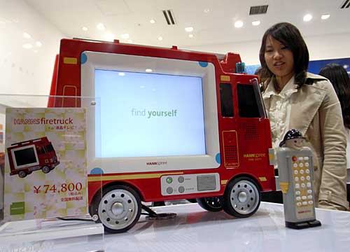12日,在日本首都東京商業(yè)街六本木的一家電器商店,顧客選購青蛙造型的液晶電視。這家商店最近新推出了一系列薯條、手提包、直升機、消防車等卡通玩具造型的液晶電視,電視大小從9.6英寸到42英寸不等,售價比普通電視稍高一點,成為很多家長裝飾兒童房間的選擇。