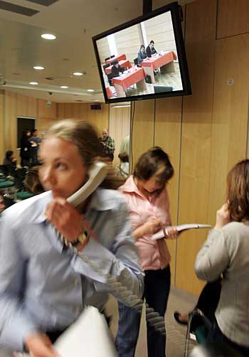 5月10日,在俄羅斯首都莫斯科的俄羅斯石油公司總部新聞中心,媒體記者觀看競拍直播。由俄羅斯政府控股的俄羅斯石油公司當天在俄羅斯尤科斯石油公司薩馬拉地區(qū)資產(chǎn)的競拍中勝出。