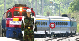 5月17日,在韓國(guó)汶山站,一名韓國(guó)軍人在即將參加京義線試運(yùn)行的韓國(guó)列車旁警戒。韓朝雙方當(dāng)天同時(shí)舉行連接朝鮮半島南北方的京義線鐵路和東海線鐵路試運(yùn)行儀式。來(lái)自韓國(guó)和朝鮮的列車分別從韓國(guó)汶山站和朝鮮金剛山站出發(fā),進(jìn)行56年來(lái)首次跨越韓朝軍事分界線的列車運(yùn)行。