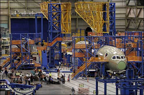 21日,在美國華盛頓州埃弗里特的波音飛機(jī)裝配工廠,工作人員組裝首架夢幻787飛機(jī)。波音公司將于7月8日在這里舉行儀式,正式推出外界期待已久的夢幻787。夢幻787是一種中型飛機(jī),由于采用了大量碳物質(zhì)材料而大大減輕了機(jī)身重量和運(yùn)行成本。