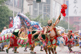 首屆中國成都國際非物質(zhì)文化遺產(chǎn)節(jié)5月23日在成都開幕,這是世界上為非物質(zhì)文化遺產(chǎn)保護(hù)舉辦的第一個國際性盛會,遺產(chǎn)節(jié)共吸引了海內(nèi)外70多家參展團(tuán)隊、1100多個非物質(zhì)文化遺產(chǎn)項目參展。圖為開幕式上的舞龍表演。
