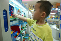 5月28日,一名小朋友在上海一家商場的玩具柜臺前擺弄玩具。 當(dāng)日,上海市消費(fèi)者權(quán)益保護(hù)委員會發(fā)布兒童節(jié)“消費(fèi)提示”,提醒家長們選購兒童玩具要查“3C”認(rèn)證;選購兒童服裝要看清標(biāo)識,以防甲醛超標(biāo);選購兒童食品要認(rèn)準(zhǔn)“QS”,以免孩子“病從口入”。 |
