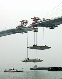 蘇通大橋的主跨合龍預(yù)計(jì)于6月中旬吊裝完畢。屆時(shí),被稱為世界第一斜拉索大橋的全長(zhǎng)32.4公里、連接蘇州與南通兩座江蘇古城的蘇通大橋?qū)⑷尕炌ā?!--/enpcontent-->