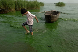 6月4日,一名村民從巢湖里上岸,岸邊的水已泛起綠色。目前巢湖水質(zhì)出現(xiàn)不同程度的富營養(yǎng)化,局部區(qū)域有藍(lán)藻出現(xiàn)。安徽省環(huán)保部門已下發(fā)通知,要求加強(qiáng)巢湖水質(zhì)監(jiān)測和預(yù)警,強(qiáng)化污染源的日常監(jiān)管,做好應(yīng)急準(zhǔn)備工作。 |