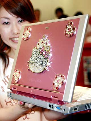 6日,日本電子業(yè)巨頭NEC公司員工在東京展示該公司新推出的一款筆記本電腦。這款筆記本電腦配有15.4英寸液晶屏,外殼上鑲有由施華洛世奇水晶組成的凱蒂貓(Hello Kitty)造型飾物,中央處理器采用美國超威(AMD)公司生產(chǎn)的閃龍芯片。該產(chǎn)品預(yù)計(jì)將于6月19日上市。