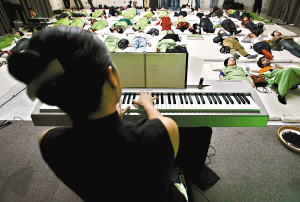 | 3月9日,在西班牙首都馬德里舉行的一場“睡眠”音樂會上,一名日本鋼琴家在眾多逐漸進入夢境的聽眾前演奏。這名鋼琴家在音樂會上演奏舒緩的音樂,讓聽眾精神完全放松而進入夢鄉(xiāng),最新研究顯示英國人普遍睡眠不足。 | 本報綜合報道