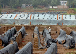 6月23日,工人在河南省上蔡縣肖李王村一個(gè)亂占耕地的磚瓦窯場工作。據(jù)介紹,河南省上蔡縣原有磚瓦窯場171座,占用耕地5600多畝,年消耗黏土資源40萬立方米。2007年5月,該縣強(qiáng)制拆除了部分非法磚瓦窯場,但一些非法窯主利欲熏心,頂風(fēng)違紀(jì),不少磚瓦場又死灰復(fù)燃。