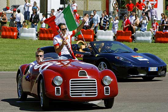 23日,在意大利的菲奧拉諾,法拉利車隊(duì)車手萊克寧(左)和馬薩駕駛法拉利公司1947年的賽車F125參加慶祝活動(dòng)。當(dāng)天,法拉利公司在大本營(yíng)菲奧拉諾舉行慶;顒(dòng),紀(jì)念這個(gè)意大利最有名氣的汽車品牌誕生60周年。