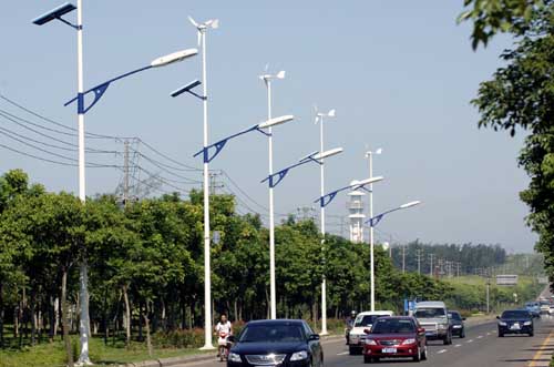 海口大力推廣清潔能源,計劃年內(nèi)開始為城區(qū)主干道安裝18000盞“風(fēng)-光互補(bǔ)”節(jié)能路燈。安裝完畢后,每年可省電費(fèi)1000萬元!帮L(fēng)-光互補(bǔ)”節(jié)能路燈采用風(fēng)能和太陽能雙保險供電,即使在陰雨天也能正常向路燈供電。圖為?谑心虾4蟮郎显囉冒惭b的“風(fēng)-光互補(bǔ)”節(jié)能路燈(7月10日攝)。