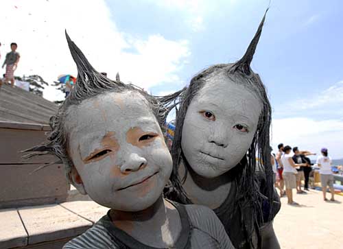 在距韓國首都首爾西南部190公里的一個(gè)海濱浴場,兩名韓國小朋友臉上涂著“泥巴”面膜面對鏡頭。這個(gè)海濱浴場每年都要舉辦泥巴節(jié),介紹泥巴作為護(hù)膚品的功效以吸引更多的游客。