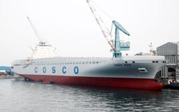 7月26日,中國最大的集裝箱船“中遠亞洲”輪停泊在韓國蔚山的現(xiàn)代重工造船廠碼頭。當天,中國遠洋運輸(集團)總公司在這里為迄今中國最大的集裝箱船“中遠亞洲”輪舉行命名儀式!爸羞h亞洲”輪是中遠集團向韓國現(xiàn)代重工定購的四艘同型船中的首制船,總長349米,可裝載10062個20英尺標準集裝箱,總排水量14萬噸。
