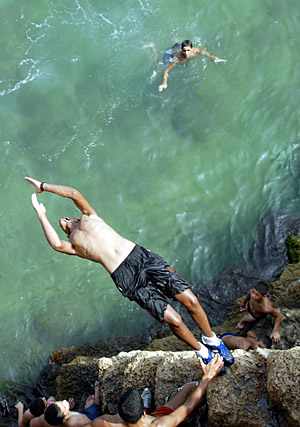 7月28日,在以色列北部海濱城鎮(zhèn)阿克,一名男孩從海邊古城墻上縱身躍入大海。近一周來,以色列全境持續(xù)干旱高溫天氣,最高平均溫度達到35攝氏度以上,局部超過40攝氏度。到海邊游泳度假成了以色列人最主要的休閑活動。