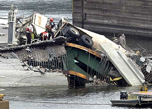 6日,清理小組的工作人員在美國明尼蘇達(dá)州密西西比河橋梁坍塌事故現(xiàn)場工作。