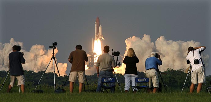 | 8日,攝影記者在美國(guó)佛羅里達(dá)州肯尼迪航天中心附近拍攝“奮進(jìn)”號(hào)航天飛機(jī)發(fā)射升空的鏡頭。美國(guó)東部時(shí)間18時(shí)36分(北京時(shí)間9日6時(shí)36分),美國(guó)“奮進(jìn)”號(hào)航天飛機(jī)載著機(jī)組7名宇航員從佛羅里達(dá)州肯尼迪航天中心發(fā)射升空,飛往國(guó)際空間站。這是“奮進(jìn)”號(hào)時(shí)隔近5年來,首次執(zhí)行飛行任務(wù)。 | |