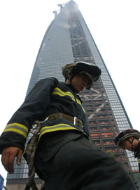 8月14日,消防員在發(fā)生火災(zāi)的上海環(huán)球金融中心工地滅火搶險(xiǎn)。 當(dāng)日下午16時(shí)30分左右,位于上海浦東的環(huán)球金融中心在建大廈失火。上海市公安、消防部門趕赴現(xiàn)場(chǎng)撲救。到17時(shí)45分左右,火勢(shì)被消防部門撲滅。這起事故中沒(méi)有人員傷亡,具體事故原因還在進(jìn)一步調(diào)查中。