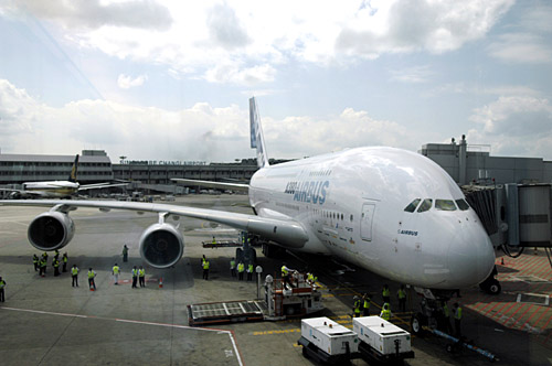 13日,一架空客A380客機(jī)在新加坡樟宜機(jī)場接受測試。當(dāng)天,9日抵達(dá)這里的一架空客A380客機(jī)開始接受為期6天的各種測試。A380客機(jī)為雙層結(jié)構(gòu),有4個發(fā)動機(jī),標(biāo)準(zhǔn)配置的座位數(shù)是519個,如果用戶需要,可以最多調(diào)整成800人以上的配置,是目前全球載客量最大的客機(jī)。