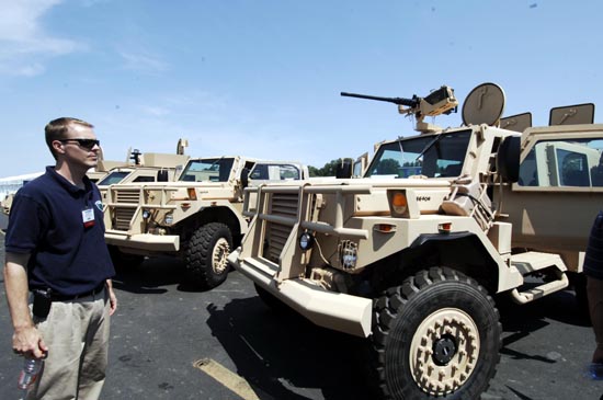 14日,一名參觀者在美國(guó)弗吉尼亞州舉行的軍事防護(hù)設(shè)備展上觀看軍用車。目前在伊拉克有1000余輛這種軍用車。當(dāng)日,第六屆美國(guó)軍事防護(hù)設(shè)備展在弗吉尼亞州的斯塔福德地區(qū)機(jī)場(chǎng)舉行,來(lái)自全球的約600個(gè)參展商展出了各自的軍事防護(hù)設(shè)備。