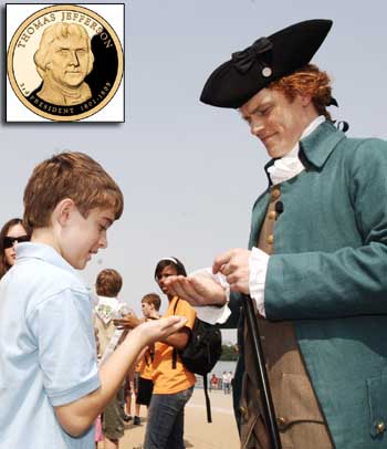 15日,在美國華盛頓的杰斐遜紀(jì)念堂前舉行的一美元杰斐遜“總統(tǒng)硬幣”發(fā)行儀式上,一名裝扮成杰斐遜的演員(右)向參加儀式的孩子們贈送杰斐遜“總統(tǒng)硬幣”。美國總統(tǒng)布什去年簽署法案,規(guī)定美國鑄幣局從今年開始鑄造鐫有去世兩年以上的美國總統(tǒng)頭像的一美元硬幣,按總統(tǒng)任職先后順序,每三個月發(fā)行一次,每年發(fā)行四種。左上角小圖為一美元杰斐遜“總統(tǒng)硬幣”的正面圖案。