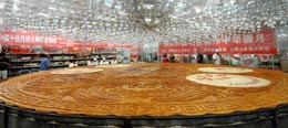 21日,在沈陽揭幕的首屆中國烘焙食品節(jié)上,10位月餅大師聯(lián)手現(xiàn)場制作的直徑大約八米的超級大月餅亮相。對于這樣的商業(yè)行為,有人認(rèn)為是“商業(yè)創(chuàng)意”,也有人責(zé)問“工程浩大”、“徒費(fèi)錢糧”,爭議之聲不斷。據(jù)介紹,“超級大月餅”皮和餡的重量至少有10噸。圖為新制作完成的大月餅。